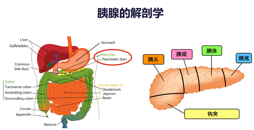 胰腺可分為5個主要部分:胰頭、鉤突、胰頸、胰體、胰尾