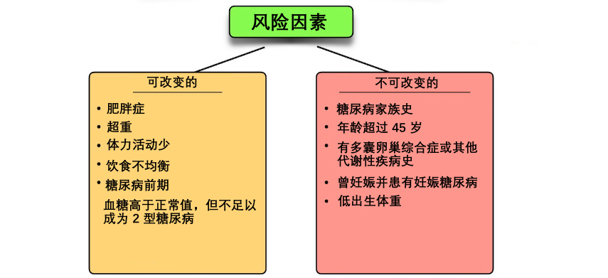不可改變的危險因素:糖尿病家族史、年齡在45歲以上、出生體重低、既往妊娠期糖尿病和多囊卵巢綜合征(PCOS)或其他代謝疾病史等。