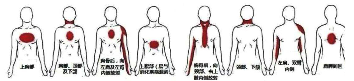 心絞痛是最常出現(xiàn)的癥狀,最為嚴(yán)重的心??芍苯颖憩F(xiàn)為心跳驟停也就是所謂的“猝死”。疼痛部位主要在前胸部,可放射至左肩、左臂內(nèi)側(cè)、下頜部、頸部、咽部、上腹部及背部上方等。