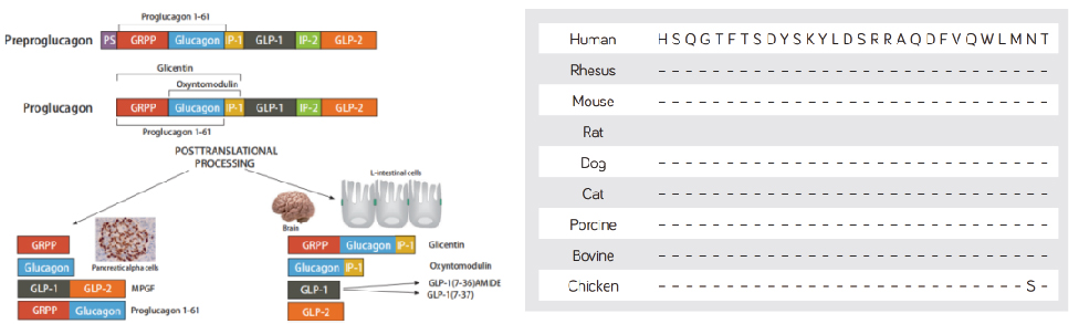 ①氨基酸少,并且衍生物同源性極高【胰高血糖素(1-29)是通過用激素原轉化酶2處理胰高血糖素原產(chǎn)生的 ,分子量為3485Da ;胰高血糖素樣肽-1(GLP-1),胰高血糖素樣肽-2(GLP-2),腸高血糖素和胃泌酸調節(jié)素來源于激素原轉化酶1處理的胰高血糖素原】 。