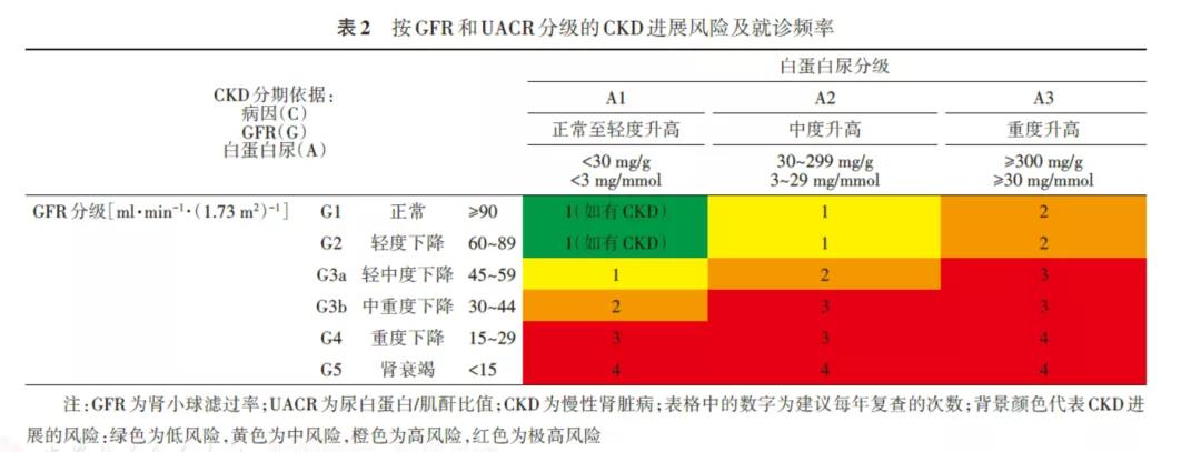 在確診DKD后,應根據(jù)GFR及尿白蛋白水平進一步判斷CKD分期,同時評估DKD進展風險及明確復查頻率。