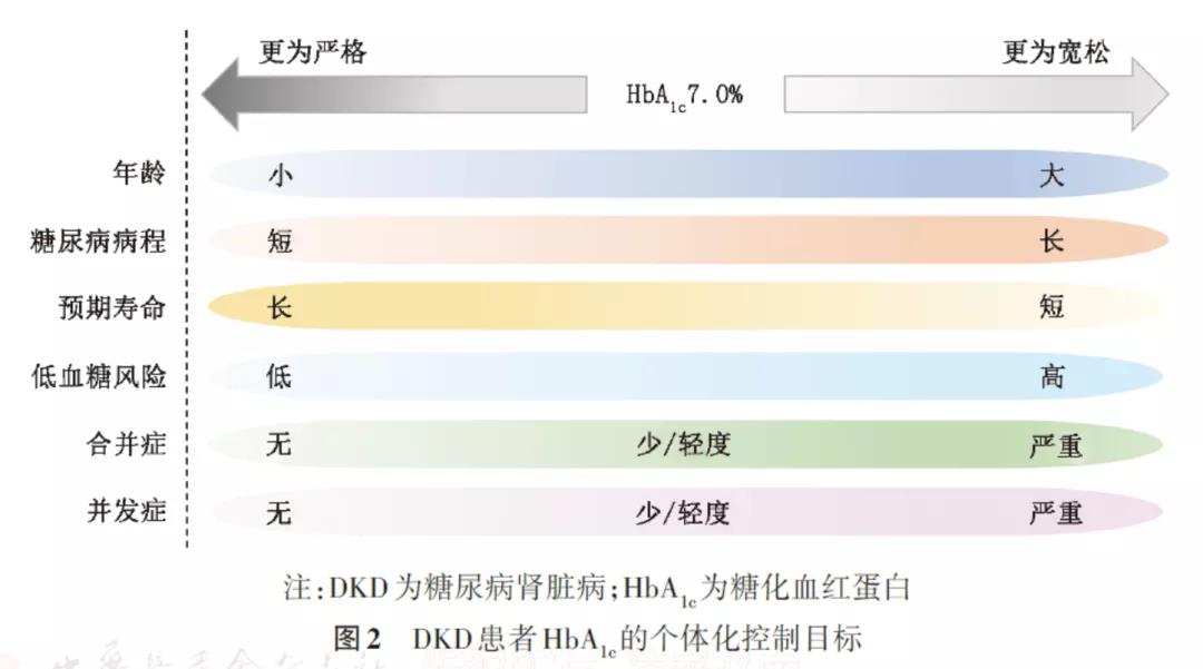 HbA1c<6%或>9%均會增加心血管及死亡風險,而強化降糖的腎臟保護作用需要較長時間(2~10年)才能出現(xiàn)。因此,在制定DKD患者的血糖控制目標時,應根據(jù)年齡、糖尿病病程、預期壽命、合并癥、并發(fā)癥、低血糖風險等,制定個體化控制目標。