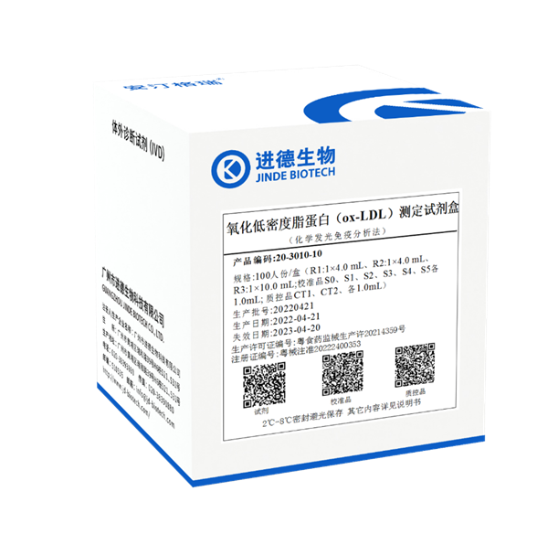 本期帶來由進德生物自主研發(fā)生產(chǎn)的一款重磅產(chǎn)品氧化低密度脂蛋白(ox-LDL)測定試劑盒(化學發(fā)光免疫分析法),目前已獲批上市,注冊證號粵械注準20222400353,該款產(chǎn)品為全球率先研發(fā)的化學發(fā)光法氧化低密度脂蛋白(ox-LDL)測定試劑盒。