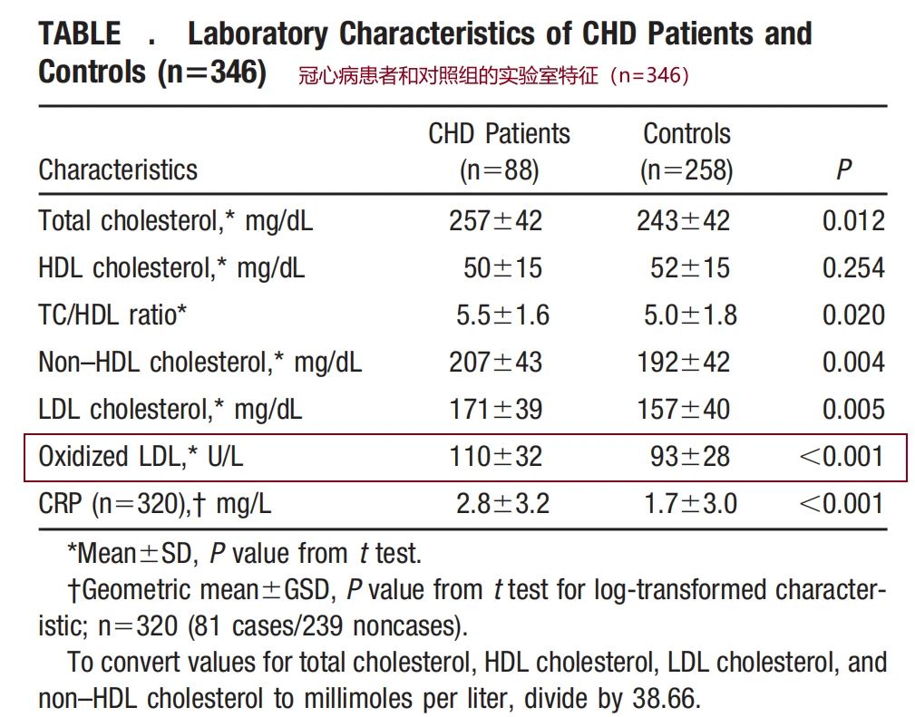 研究對(duì)象為進(jìn)行2項(xiàng)基于人群的MONICA/KORA調(diào)查,并進(jìn)行了隨訪(平均SD隨訪時(shí)間,5.6±2.6年)。通過(guò)ELISA檢測(cè)88名冠心病患者和258名與調(diào)查匹配的對(duì)照組的ox-LDL以及風(fēng)險(xiǎn)比(HR)。