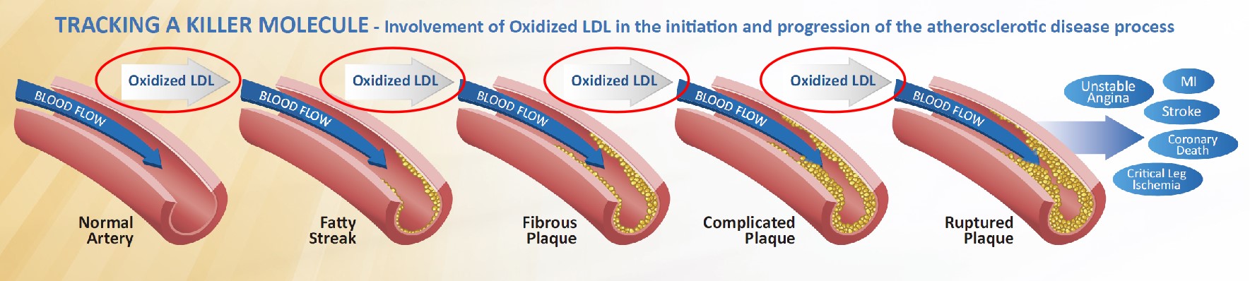 氧化低密度脂蛋白(ox-LDL)是低密度脂蛋白(LDL)的致動(dòng)脈粥樣硬化形式,它是一種斑塊特異性脂蛋白,在動(dòng)脈粥樣硬化疾病過(guò)程中起著關(guān)鍵作用。氧化型低密度脂蛋白主要存在于動(dòng)脈粥樣硬化斑塊中,而非正常動(dòng)脈中,它直接參與動(dòng)脈粥樣硬化的發(fā)生和發(fā)展:從單核細(xì)胞/巨噬細(xì)胞早期轉(zhuǎn)化為泡沫細(xì)胞,到斑塊不穩(wěn)定和破裂的晚期階段。