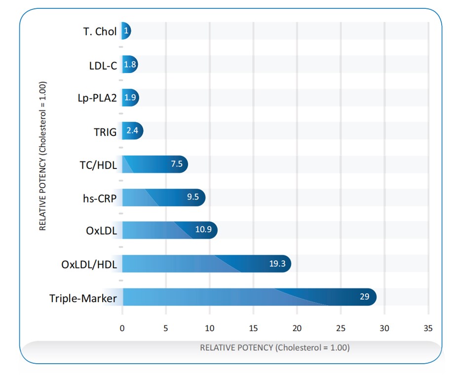 美國(guó)Shiel醫(yī)學(xué)實(shí)驗(yàn)室所做的生物標(biāo)志物對(duì)冠狀動(dòng)脈疾病患者的相對(duì)有效性研究表明,將總膽固醇(T.Chol)對(duì)于心血管事件的有效性定義為1,則LDL-C為1.8,ox-LDL為10.9,ox-LDL三聯(lián)檢(ox-LDL / HDL * hs-CRP)為29,ox-LDL檢測(cè)的有效性大幅提升。