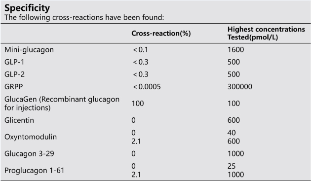 檢測試劑開發(fā)時,N端抗體會與胃泌酸調(diào)節(jié)素(oxyntomodulin)發(fā)生交叉反應(yīng),而 C 端抗體則會與胰高血糖素原1-61發(fā)生交叉反應(yīng),針對胰高血糖素中間片段開發(fā)的抗體則有可能與上述所有肽結(jié)合【11】。胰高血糖素的測定需要針對兩個末端的雙抗體夾心技術(shù),抗體特異性要求高。