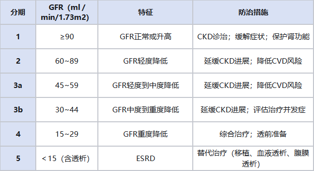 慢性腎臟病的分期目前普遍采用的是美國腎臟基金會制定的指南,按照腎臟病改善全球預(yù)后(KDIGO)指南的分期標(biāo)準(zhǔn),將慢性腎臟病根據(jù)eGFR分為1-5期。