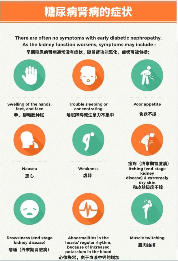 糖尿病腎病目前已成為慢性腎臟病和終末期腎病的主要原因,早期的糖尿病腎病通常沒有特征,但隨著腎功能惡化,癥狀可能包括:食欲不振、惡心、嗜睡等。