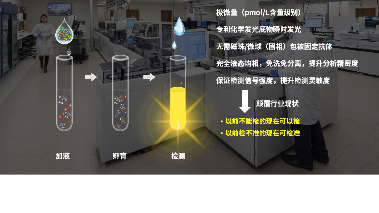 全球首家用完全均相化學(xué)發(fā)光法檢測所有的糖尿病和冠心病相關(guān)指標(biāo),實現(xiàn)同一份標(biāo)本在同一臺儀器上一次性得到所有需要的檢測結(jié)果;無需包被固定和分離洗滌,具有快速精準(zhǔn),產(chǎn)生醫(yī)療廢液少,成本更低和經(jīng)濟(jì)環(huán)保等優(yōu)點。